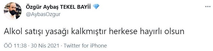 Türkiye Tekel Bayileri Platformu Başkanı Özgür Aybaş, kişisel Twitter hesabında "Alkol satışı yasağı kalkmıştır, herkese hayırlı olsun" paylaşımında bulundu. Paylaşıma yanıt veren İçişleri Bakanlığı "resmi olmayan açıklamalara itibar etmeyin" dedi