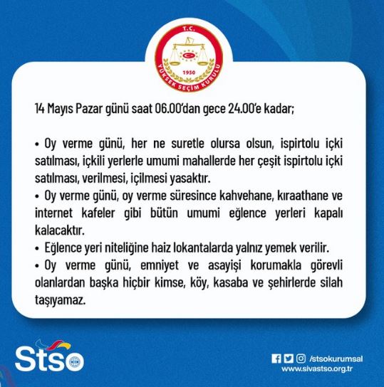 298 sayılı Kanunun 79.maddesi gereği; "Oy verme günü, her ne suretle olursa olsun, ispirtolu içki satılması, içkili yerlerle umumi mahallerde her çeşit ispirtolu içki satılması, verilmesi, içilmesi yasaktır. Oy verme günü, bütün umumi eğlence yerleri oy verme süresince kapalı kalır. Eğlence yeri niteliğine haiz lokantalarda yalnız yemek verilir. Oy verme günü, emniyet ve asayişi korumakla görevli olanlardan başka hiçbir kimse, köy, kasaba ve şehirlerde silah taşıyamaz." (HABER MERKEZİ)
