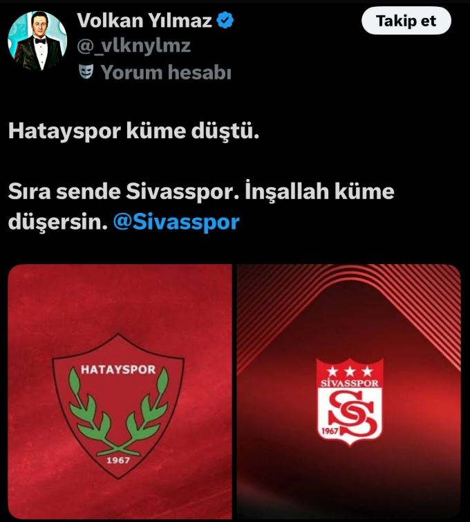 Bu konuşmayı yapan kulüp başkanı ise bence yersiz bir konuşma yapmış senin haddine mi Sivasspor ile uğraşmak sen gol attın hakem mi vermedi bunları TFF yi konuş hakem hatalarını konuş Sivasspor aslanlar gibi çıktı oynadı kazandı