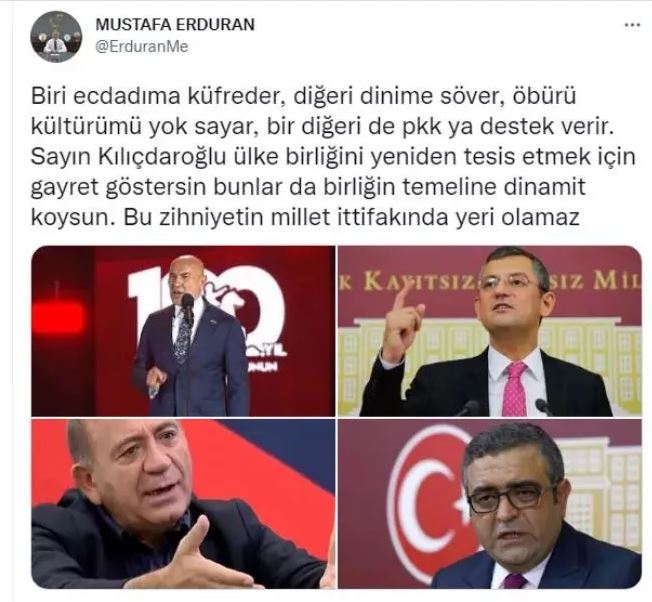 Sosyal medya hesabından açıklama yapan Erduran, ''Biri ecdadıma küfreder, diğeri dinime söver, öbürü kültürümü yok sayar, bir diğeri de PKK'ya destek verir. Sayın Kılıçdaroğlu ülke birliğini yeniden tesis etmek için gayret göstersin bunlar da birliğin temeline dinamit koysun. Bu zihniyetin millet ittifakında yeri olamaz.'' ifadelerini kullandı.