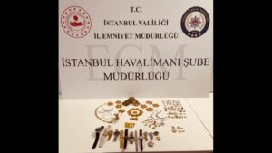 İstanbul Havalimanı'nda yapılan operasyonda, yabancı uyruklu kadın yolcunun üzerinden 3 kilo 117 gram külçe takoz altın, çeşitli markalara ait ortalama değeri 565 bin lirayı bulan 14 kol saati 352 bin lira değerinde yüzük, kolye ve küpeden oluşan ziynet eşyası ile tarihi eser niteliğinde sikkeler ele geçirildi.