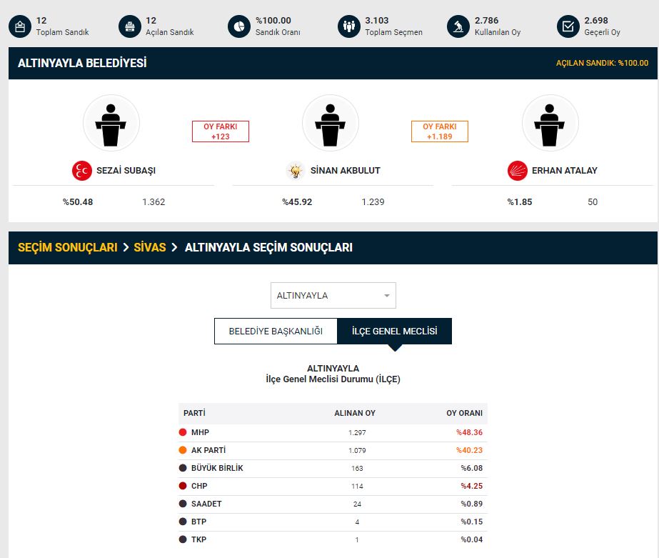 İşte 31 Mart 2024 Yerel Seçimlerinde Altınyayla İlçesinin Başkanlık seçim sonuçları..