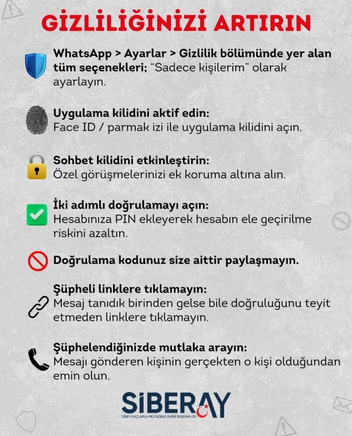Para talep eden mesajlarda ilgili kişinin farklı bir iletişim kanalı üzerinden mutlaka teyit edilmesi gerektiği belirtilirken, WhatsApp’ın iki adımlı doğrulama özelliğinin aktif hale getirilmesinin önemine de dikkat çekildi.