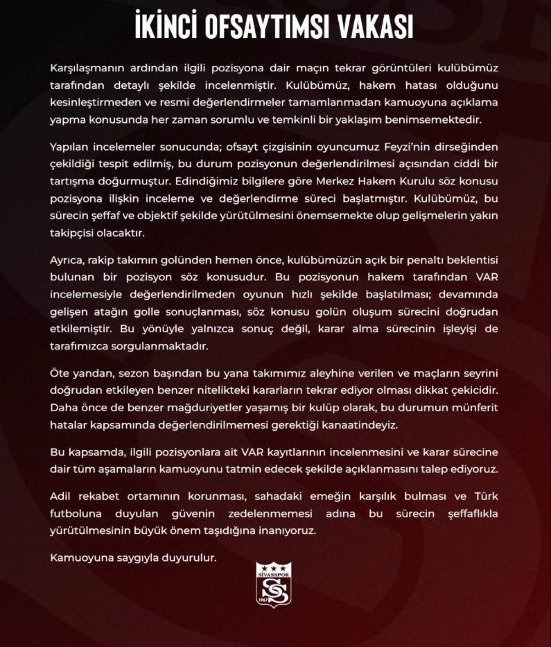 Yapılan incelemeler sonucunda, ofsayt çizgisinin Sivassporlu futbolcu Feyzi’nin dirseğinden çekildiğinin tespit edildiği belirtilen açıklamada, bu durumun pozisyonun değerlendirilmesi açısından ciddi bir tartışma yarattığına dikkat çekildi. Kulüp, edindiği bilgilere göre Merkez Hakem Kurulu’nun söz konusu pozisyona ilişkin inceleme ve değerlendirme süreci başlattığını da kamuoyuyla paylaştı.