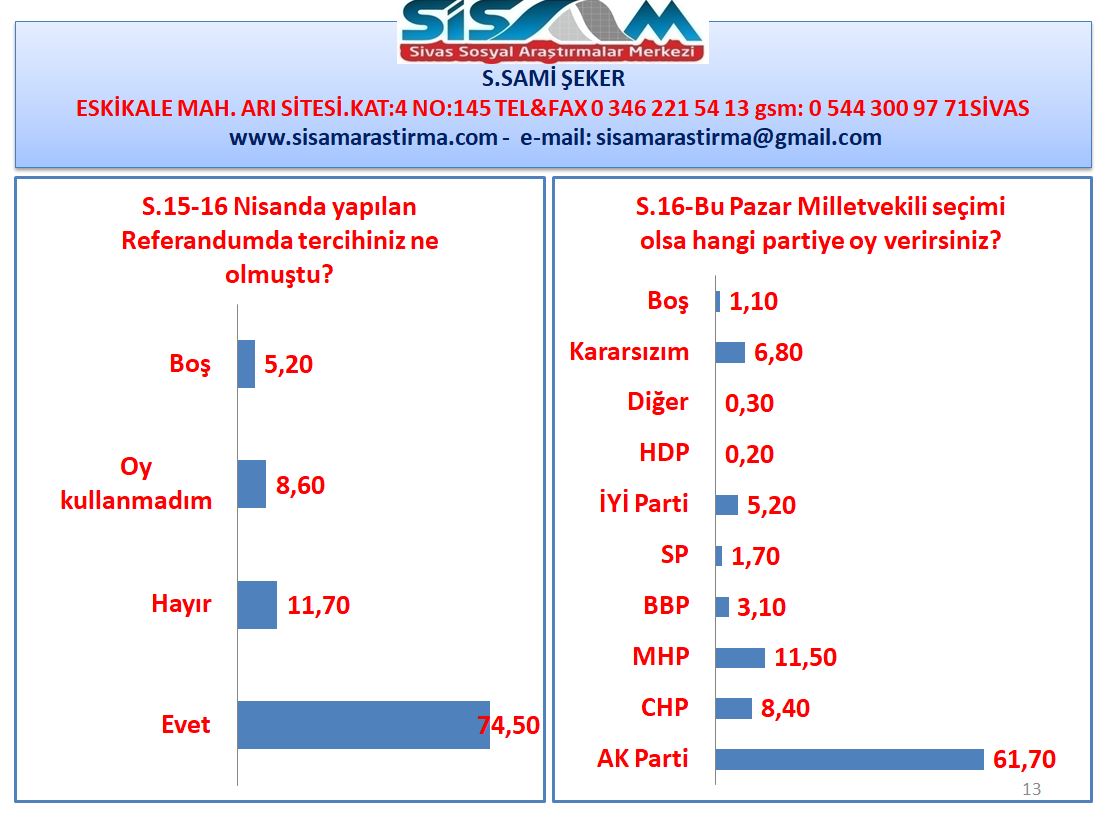 Sisamın anketinde Partilerin Sivas Merkez ilçe oyları şu şekildeydi.