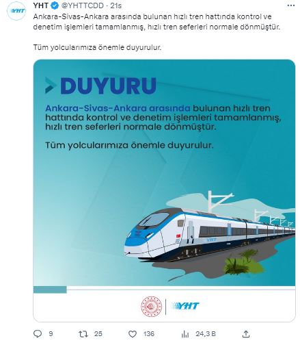 Yapılan açıklamada: "Ankara-Sivas-Ankara arasında bulunan hızlı tren hattında kontrol ve denetim işlemleri tamamlanmış, hızlı tren seferleri normale dönmüştür.