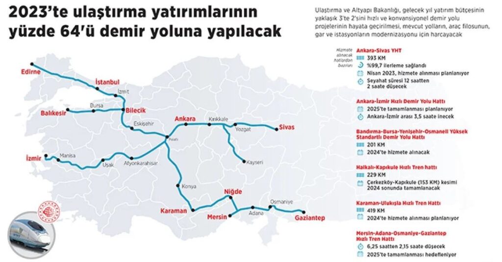Bu kapsamda, Ankara-Sivas Yüksek Hızlı Tren (YHT) Hattı'ndaki çalışmalar devam ederken, Ulaştırma ve Altyapı Bakanı Adil Karaismailoğlu, Bakanlığın bütçe görüşmelerinde hattın altyapı çalışmalarında yüzde 99,67 fiziki ilerleme sağlandığını belirtmişti. 393 kilometre uzunluğunda ve 27,4 milyar lira tutarındaki hızlı tren hattında sinyalizasyon yazılım, test ve devreye alınmasına yönelik çalışmalar devam ediyor. Proje, 2023 yılı nisan ayında tamamlandığında seyahat süresinin 12 saatten 2 saate düşmesi hedefleniyor.