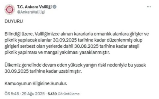 “Ormanlık alanlara girişler ve piknik yapılacak alanlarda ateşli piknik yapılması ve mangal yakılması, ülkemiz genelinde devam eden yüksek yangın riski nedeniyle 30 Eylül tarihine kadar uzatılmıştır.”