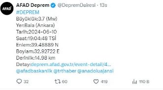 Ankara'nın Bala ilçesinde 3.7 büyüklüğünde bir deprem meydana geldi.