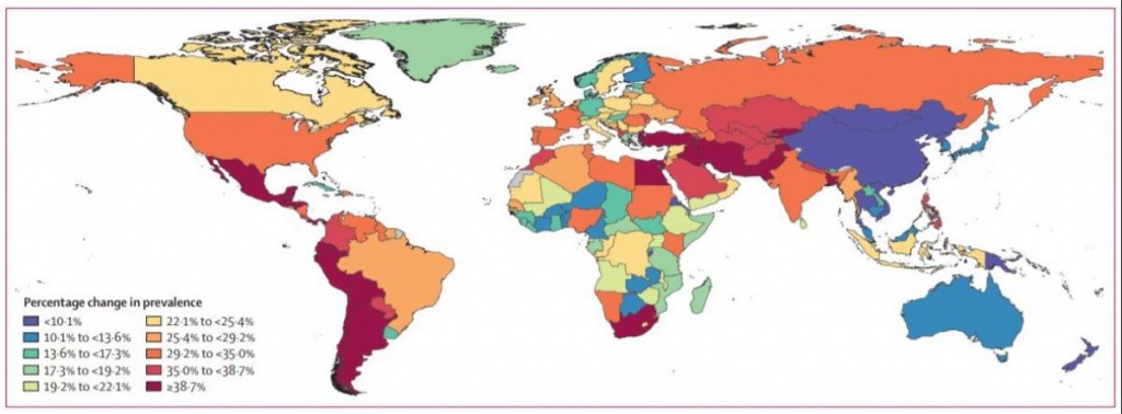Oluşturulan haritada Türkiye, koronavirüs nedeniyle meydana gelen depresif bozukluğun yaygınlığında yüzde 38,7'lik değişim yaşadı.