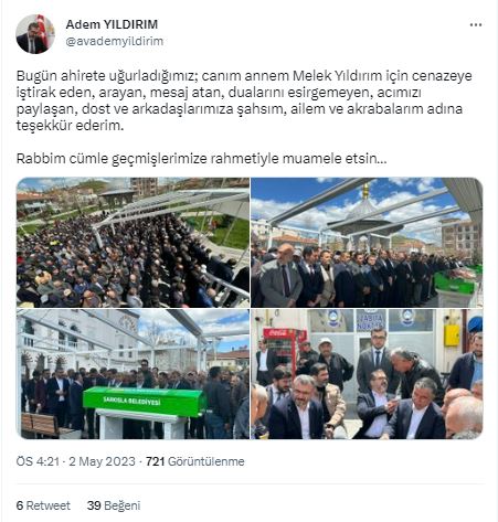 Önceki Dönem AK Parti İstanbul İl Başkan Yardımcısı ve 28. Dönem AK Parti İstanbul Milletvekili Adayı Adem Yıldırım dün sosyal medya hesabından yaptığı paylaşımla annesi Melek Yıldırım’ı kaybettiğini açıklamıştı.