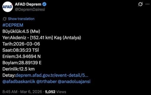 Antalya açıklarında 4.5 büyüklüğünde deprem.. Antalya’nın Kaş ilçesi açıklarında sabah saatlerinde meydana gelen deprem bölgede kısa süreli paniğe neden oldu.