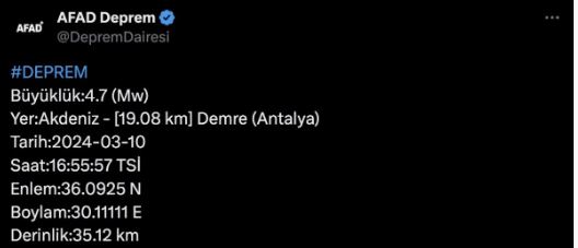 Antalya'nın Demre ilçesinde saat 16.55'te 4.7 büyüklüğünde deprem meydana geldi.