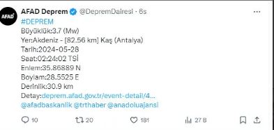 Antalya'nın Kaş ilçesinde 3.7 büyüklüğünde bir deprem meydana geldi.