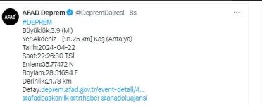 Antalya'nın Kaş ilçesinde akşam saatlerinde 3.9 büyüklüğünde bir deprem meydana geldi.