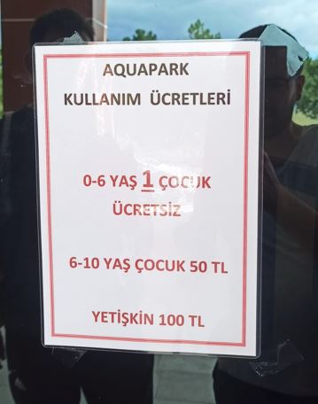 Şuan 0-6 yaş arası 1 çocuk ücretsiz olarak tesisten faydalanabilirken bir çocuktan sonrası için ise ücret talep ediliyor. 6-10 yaş arası çocuklardan 50 TL alınırken, yetşkinler ise AQUAPARK'ten faydalanabilmek için 100 TL ödemek zorunda...