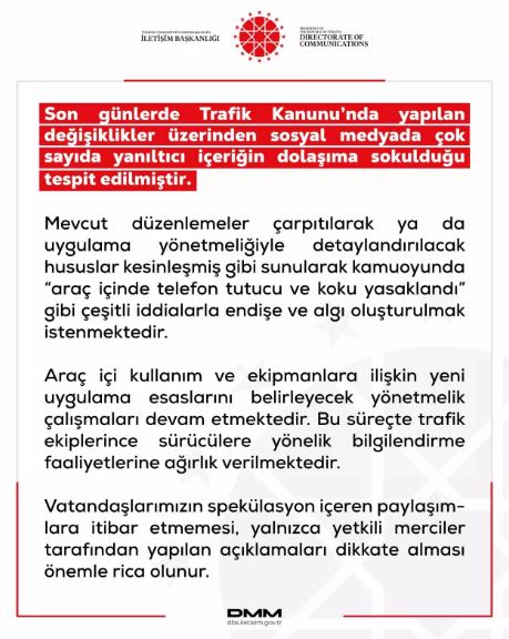Dezenformasyonla Mücadele Merkezi tarafından yapılan açıklamada, araç içi kullanım ve ekipmanlara ilişkin yeni uygulama esaslarını belirleyecek yönetmelik çalışmalarının sürdüğü vurgulandı. Bu süreçte herhangi bir yasak kararının kesinleşmediği kaydedildi.