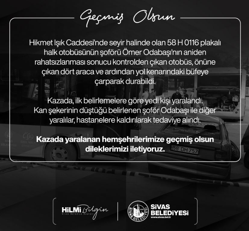 Sivas Valisi Dr. Yılmaz Şimşek, kontrolden çıkan halk otobüsünün 7 kişinin yaralanmasına neden olduğu kazanın, otobüs sürücüsünün kalp krizi geçirmesi nedeniyle meydana geldiğini söylemişti
