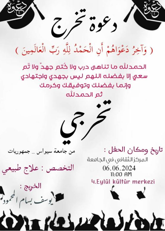 Yousseff Bassam Al-Mahmoud isimli yabancı uyruklu bir öğrencinin isminin yazıldığı söz konusu davetiyede, Arapça, “Allah'a hamdolsun, O'nun lütfu dışında hiçbir yol bitmez, hiçbir çaba tamamlanmaz. Allah'ım, benim çabam ve gayretimle değil, senin lütfunla, başarınla ve cömertliğinle hamd olsun” ifadeleri kullanıldı.