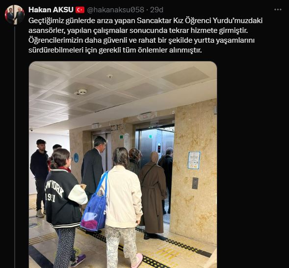 AK Parti Sivas Milletvekili Hakan Aksu, sosyal medya hesabından yaptığı paylaşımla Sancaktar Kız Öğrenci Yurdu asansörleriyle ilgili açıklama yaptı. Yapılan çalışmalar sonucunda asansörlerin tekrar hizmete alındığını belirten Aksu, öğrencilerin daha güvenli ve rahat bir şekilde yurtta yaşamlarını sürdürebilmeleri için gerekli tüm önlemlerin alındığını ifade etti. Milletvekili Aksu, eğitimin ve öğrencilerin yaşam koşullarının iyileştirilmesinin her zaman öncelikleri olduğunu belirterek, "Eğitimde ve yaşamda rahatlık, huzur ve güven her zaman önceliğimiz olmuştur. Bu süreçte sabır gösteren tüm öğrencilerimize teşekkür ediyor, eğitim hayatlarında başarılar diliyorum" dedi.