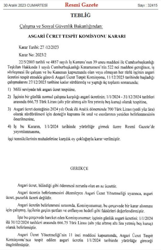 Resmi Gazete’de yayımlanan Asgari Ücret Tespit Komisyonu kararına göre, 4857 sayılı İş Kanunu’nun 39’uncu maddesi ile Cumhurbaşkanlığı Teşkilatı Hakkında 1 sayılı Cumhurbaşkanlığı Kararnamesi’nin 522’nci maddesi gereğince iş sözleşmesi ile çalışan ve bu kanunun kapsamında olan veya olmayan her türlü işçinin asgari ücretini tespit etmekle görevli Asgari Ücret Tespit Komisyonu 11 Aralık günü başladığı çalışmalarını 27 Aralık tarihine kadar sürdürdü ve 3 toplantı gerçekleştirdi. Yapılan 3 toplantı sonucunda; işçinin bir günlük normal çalışma karşılığı asgari ücretinin 2024 yılı için 666 lira 75 kuruş olarak tespitine ve asgari ücret desteğinin 700 Türk Lirası olarak sürdürülmesinin önerilmesine işçi temsilcilerinin muhalefetine karşılık oy çokluğu ile karar verildi. (İHA)