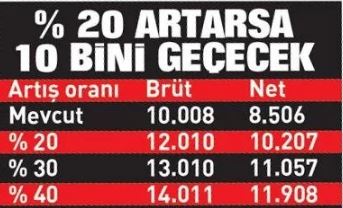 Yüzde 20'lik bir artış durumunda brüt 12 bin 10 lira, net 10 bin 207 lira, yüzde 30'luk artış durumunda net 11 bin 57 lira, brüt 13 bin 10 lira, yüzde 40 artış durumunda da net 11 bin 908 lira, brüt 14 bin 11 lira olacak.