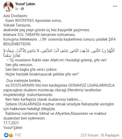 Sivas eski Müftüsü Yusuf Şahin'in yaptığı paylaşım yürek burktu. Şahin'in kızı Koronavirüs aşısı Biontech'i olduktan sonra kısmı felç geçirdi, konuşamaz hale geldi ve sürekli baygınlık geçiriyor.