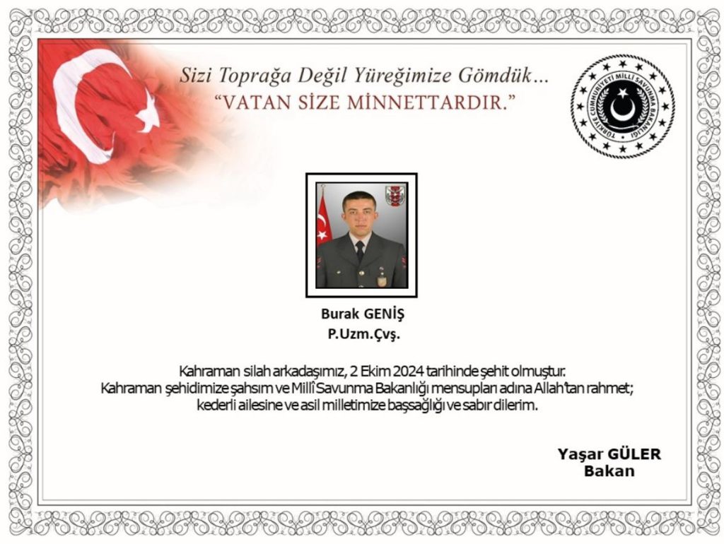Iğdır'da konuşlu 5. Hudut Tugay Komutanlığında görevli Piyade Uzman Çavuş Burak Geniş, Ağrı’nın Doğubayazıt ilçesinde askeri aracın devrilmesi sonucu şehit oldu.