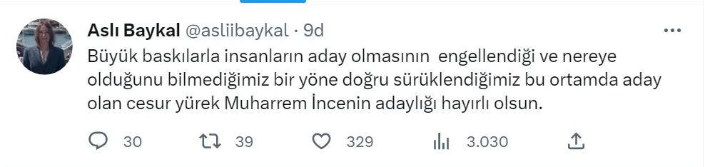 Kişisel Twitten hesabından son paylaşımını, 15 gün önce Saadet Partisi tabanından Kemal Kılıçdaroğlu'nun adaylığına yönelik eleştirilere destek veren Aslı Baykal, 15 günlük suskunluğunu bozdu. Baykal, "Büyük baskılarla insanların aday olmasının engellendiği ve nereye olduğunu bilmediğimiz bir yöne doğru sürüklendiğimiz bu ortamda aday olan cesur yürek Muharrem İncenin adaylığı hayırlı olsun" dedi.-internethaber