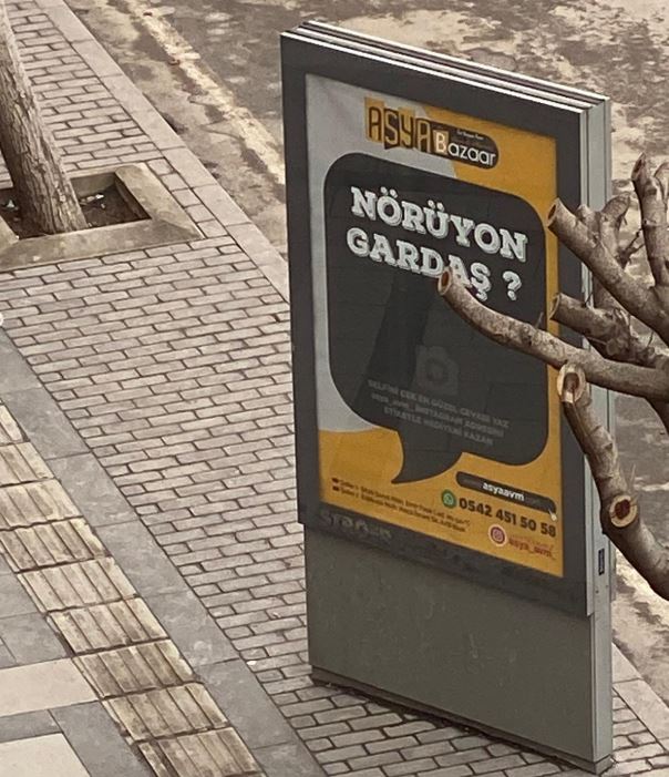 Asılan reklamlar sosyal medyada da gündem konusu olurken, ilk kez reklamı görenler ise geçen ifadelere tebessüm ediyor.