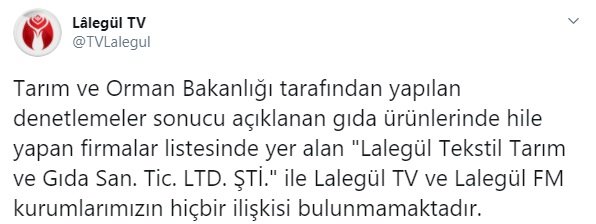 İsmailağa cemaatinin yayın organı olan Lalegül Tv'nin resmi hesabından yapılan açıklamada, "Tarım ve Orman Bakanlığı tarafından yapılan denetlemeler sonucu açıklanan gıda ürünlerinde hile yapan firmalar listesinde yer alan "Lalegül Tekstil Tarım ve Gıda San. Tic. LTD. ŞTİ." ile Lalegül TV ve Lalegül FM kurumlarımızın hiçbir ilişkisi bulunmamaktadır" denildi.