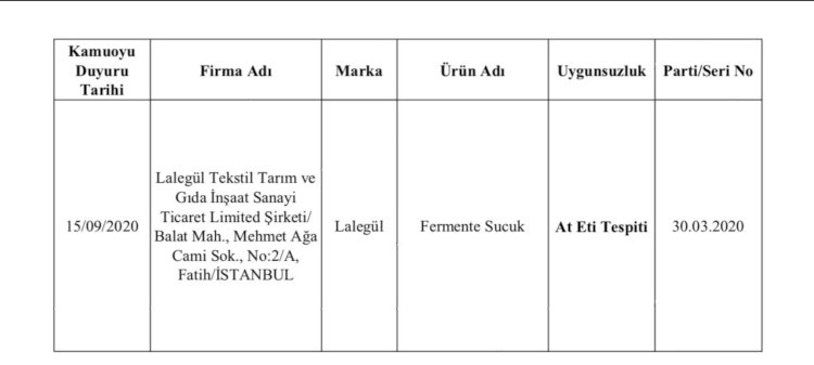 Tarım ve Orman Bakanlığı taklit ve tağşiş yapıldığı tespit edilen ürünlerin ve firmaların listesini kamuoyuyla paylaştı. Sahteciliği açıklanan 91 firma arasındaki Lalegül Tekstil Tarım ve Gıda İnşaat Sanayi Ticaret ve Limited şirketinin ürettiği sucuklarda at eti çıktığı ifşa edildi.