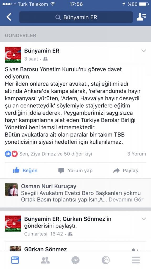 Sivas Barosuna bağlı avukatlardan Av. Bünyamin Er, sosyal medya hesabı facebook’tan “Sivas Barosu Yönetim Kurulu'nu göreve davet ediyorum. Her ilden onlarca stajyer avukatı, staj eğitimi adı altında Ankara'da kampa alarak 'referandumda hayır kampanyası' yürüten, 'Adem, Havva'ya hayır deseydi şu an cennetteydik' söylemiyle stajyerlere eğitim verdiğini iddia ederek, Peygamberimizi saygısızca hayır kampanyalarına alet eden Türkiye Barolar Birliği Yönetimi beni temsil etmemektedir. Bütün avukatlara ait olan paralar bir takım TBB yöneticisinin siyasi hedefler için kullanılamaz.” Şeklinde mesaj paylaşarak adeta Sivas’taki avukatlara örnek oldu.