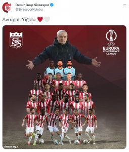 Paylaşıma, UEFA Avrupa Konferans Ligi logosu, Sivasspor logosu, Teknik Direktör Rıza Çalımbay ve Sivassporlu futbolcular görseli yerleştirildi. Paylaşıma “Avrupalı Yiğido” notu da yazıldı.(İHA)