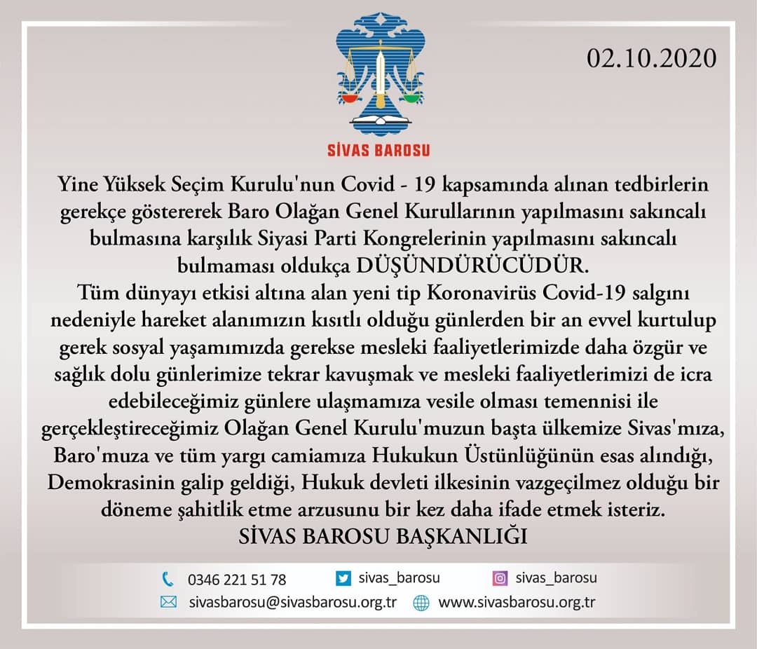 Sivas Barosu yaptığı açıklama da "... siyasi partilerin kongresinin yapılmasının sakıncalı bulunmayıp, baroların genel kurullarının yapılmaması manidardır" dendi.