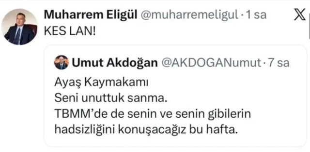 Bunun ardından Kaymakam Eligül’ün Akdoğan’ın paylaşımına sert ifadelerle yanıt verdiği öne sürüldü. Tepki çeken paylaşımın daha sonra silindiği, ayrıca Kaymakam Eligül’ün sosyal medya hesabını erişime kapattığı görüldü.