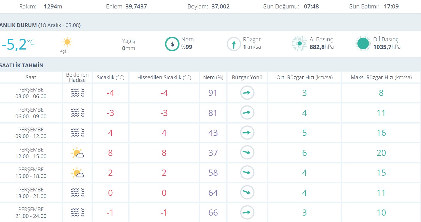 Meteorolojik verilere göre Sivas’ta 18 Aralık gecesi hava sıcaklığı eksi 5,2 dereceye kadar düştü. Açık ve yağışsız bir havanın hâkim olduğu kentte, nem oranı yüzde 99’a ulaştı. Rüzgârın saatte 1 kilometre hızla hafif şekilde estiği görülürken, yüksek nem nedeniyle soğuk havanın etkisi daha fazla hissedildi.