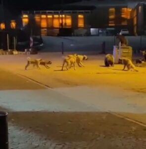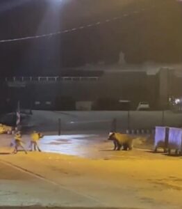 Çöp kovalarını deviren ayılar, vatandaşlar ve otellerin attığı artıkları yemeye çalıştığında köpeklerin saldırısına uğradı. Ayılardan biri köpekleri kendilerine yaklaşmaması için oyalarken, diğer ayı ise çöpleri karıştırmaya devam etti.