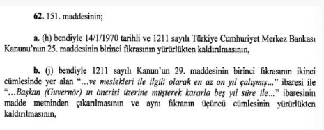 151. maddesinin; (h) bendiyle 14/1/1970 tarihli ve 1211 sayılı Türkiye Cumhuriyet Merkez Bankası Kanunu'nun 25. maddesinin birinci fıkrasının yürürlükten kaldırılmasının, (j) bendiyle 1211 sayılı Kanun'un 29. maddesinin birinci fıkrasının ikinci cümlesinde yer alan "... ve meslekleri ile ilgili olarak en az on yıl çalışmış..." ibaresi ile “... Başkan'ın (Guvernör) önerisi üzerine müşterek kararla beş yıl süre ile...” ibaresinin madde metninden çıkarılmasının ve aynı fıkranın üçüncü cümlesinin yürürlükten kaldırılmasının...