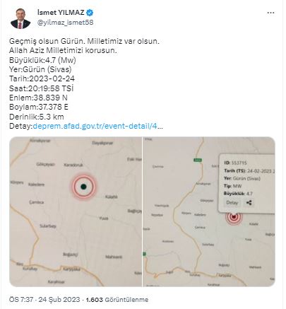 TBMM AK Parti Grup Başkanı ve AK Parti Sivas Milletvekili İsmet Yılmaz az önce Sivas’ın Gürün İlçesinde 4.7 şiddetinde meydana gelen depremle ilgili sosyal medya hesabından açıklama yaptı.