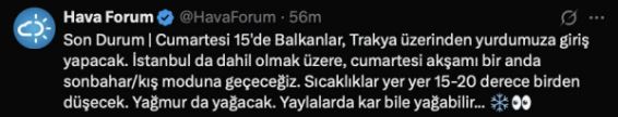 Meteoroloji kaynaklarından Hava Forum, sosyal medya hesabından yaptığı açıklamada, “Cumartesi saat 15.00 itibarıyla Balkanlar üzerinden gelen soğuk hava Trakya üzerinden yurdumuza giriş yapacak. İstanbul da dahil olmak üzere birçok şehirde sonbahar/kış havası yaşanacak. Sıcaklıklar bir anda 15-20 derece düşecek. Yağmur etkili olacak, yaylalarda kar bile yağabilir” ifadelerini kullandı.