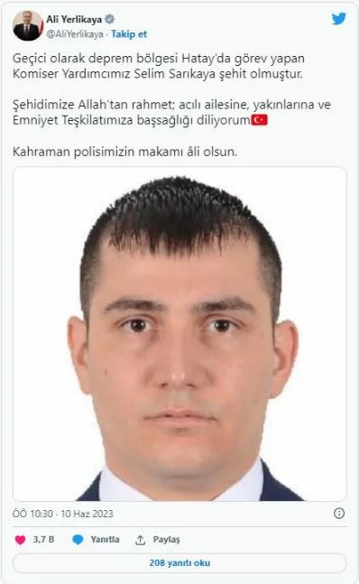 İçişleri Bakanı Ali Yerlikaya'da sosyal medyadan yaptığı paylaşımda, ”Geçici olarak deprem bölgesi Hatay’da görev yapan Komiser Yardımcımız Selim Sarıkaya şehit olmuştur. Şehidimize Allah’tan rahmet, acılı ailesine, yakınlarına ve Emniyet Teşkilatımıza başsağlığı diliyorum" ifadelerini kullandı. (İHA-HABER MERKEZİ)