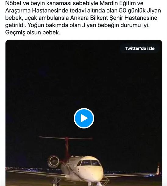 Sağlık Bakanı Fahrettin Koca, Twitter hesabından yaptığı paylaşımda, Jiyan bebeğin nakli sırasında çekilen görüntüleri paylaşarak, "Nöbet ve beyin kanaması sebebiyle Mardin Eğitim ve Araştırma Hastanesinde tedavi altında olan 50 günlük Jiyan bebek, uçak ambulansla Ankara Bilkent Şehir Hastanesine getirildi. Yoğun bakımda olan Jiyan bebeğin durumu iyi. Geçmiş olsun bebek" dedi.