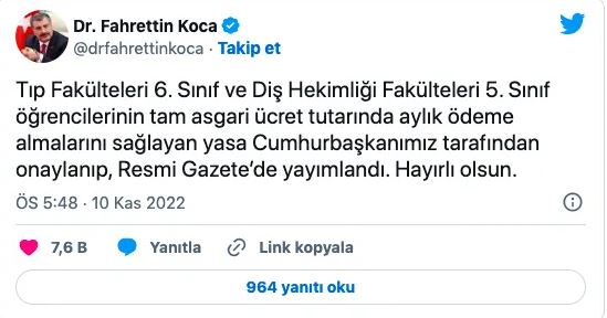 Kararın Resmi Gazete'de yayımlandığını açıklayan Koca, sosyal medya hesabından yaptığı paylaşımda "Tıp Fakülteleri 6. Sınıf ve Diş Hekimliği Fakülteleri 5. Sınıf öğrencilerinin tam asgari ücret tutarında aylık ödeme almalarını sağlayan yasa Cumhurbaşkanımız tarafından onaylanıp, Resmi Gazete’de yayımlandı. Hayırlı olsun." ifadelerine yer verdi.