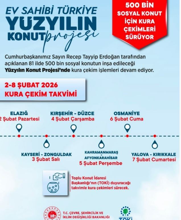 - 7 Şubat Cumartesi: Yalova’da bin 805, Kırıkkale’de bin 736 konut için kura çekimi yapılacak.