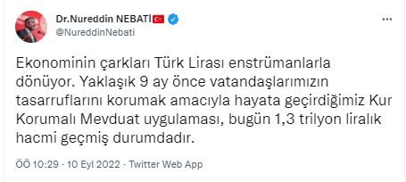 Hazine ve Maliye Bakanı Nureddin Nebati sosyal medya hesabından yaptığı açıklamada: "Ekonominin çarkları Türk Lirası enstrümanlarla dönüyor. Yaklaşık 9 ay önce vatandaşlarımızın tasarruflarını korumak amacıyla hayata geçirdiğimiz Kur Korumalı Mevduat uygulaması, bugün 1,3 trilyon liralık hacmi geçmiş durumdadır." ifadelerine yer verdi.