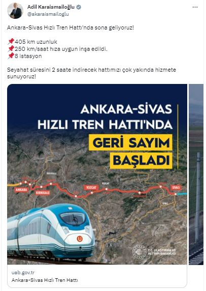 T.C. Ulaştırma ve Altyapı Bakanı Adil Karaismailoğlu sosyal medya hesabından merakla beklenen Ankara-Sivas hızlı tren hattı ile ilgili paylaşım yaptı.