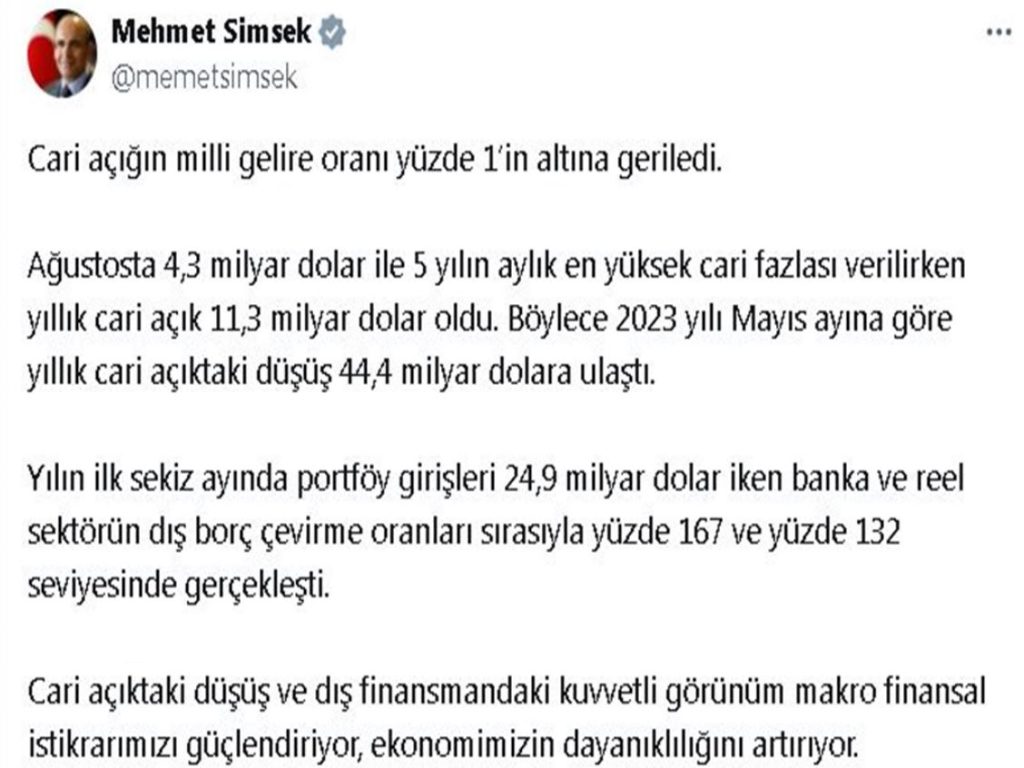 Bakan Mehmet Şimşek, sosyal medya hesabından yaptığı açıklamada, "Cari açığın milli gelire oranı yüzde 1'in altına geriledi. Ağustosta 4,3 milyar dolar ile 5 yılın aylık en yüksek cari fazlası verilirken yıllık cari açık 11,3 milyar dolar oldu. Böylece 2023 yılı Mayıs ayına göre yıllık cari açıktaki düşüş 44,4 milyar dolara ulaştı. Yılın ilk 8 ayında portföy girişleri 24,9 milyar dolar iken banka ve reel sektörün dış borç çevirme oranları sırasıyla yüzde 167 ve yüzde 132 seviyesinde gerçekleşti. Cari açıktaki düşüş ve dış finansmandaki kuvvetli görünüm makro finansal istikrarımızı güçlendiriyor, ekonomimizin dayanıklılığını artırıyor" ifadelerini kullandı. (DHA)