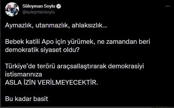 İçişleri Bakanı Süleyman Soylu, Pervin Buldan'a tepki göstererek "Aymazlık, utanmazlık, ahlaksızlık… Bebek katili Apo için yürümek, ne zamandan beri demokratik siyaset oldu?" dedi.