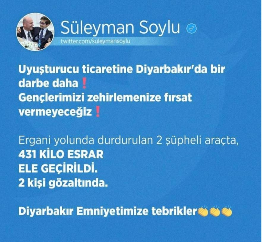 İçişleri Bakanı Süleyman Soylu, sosyal medya hesabından yaptığı paylaşımda, “Uyuşturucu ticaretine Diyarbakır’da bir darbe daha. Gençlerimizi zehirlemenize fırsat vermeyeceğiz. Ergani yolunda durdurulan 2 şüpheli araçta, 431 kilogram esrar ele geçirildi. 2 kişi gözaltına alındı. Diyarbakır Emniyetimize tebrikler” ifadelerine yer verdi.-iha